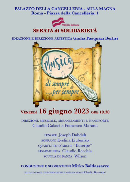 Musica di sempre… per sempre   Ideazione e direzione artistica di Giulia Pasquazi Berliri.   Serata di solidarietà dedicata al  Progetto Lettonia.   Roma, 16 giugno 2023, ore 19:30  …