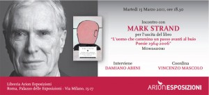 Mark Strand, Premio Pulitzer per la poesia nel 1999, incontrerà i lettori il 15 marzo 2011 alle ore 18.30 all’interno della libreria Arion Esposizioni, nel cuore di Roma, per presentare il suo ultimo libro dal titolo “L’uomo che cammina un passo avanti al buio”, una raccolta delle sue poesie dal 1964 al 2006. Interviene Damiano Abeni. Coordina Vincenzo Mascolo.