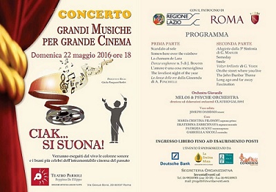 “Un lavoro difficile – spiega l’ideatrice dell’evento Giulia Pasquazi Berliri – nel quale si cimentano 35 elementi (tutti giovani di Conservatorio e al di sotto dei 28 anni) diretti da un altrettanto giovane direttore, Claudio Galassi, diplomato al Conservatorio dell’Aquila che ha anche curato le elaborazioni musicali, una sorta di rispettoso restyling, che rende i brani ancor più godibili e con un impatto che coinvolge i due sensi estetici per eccellenza, l’occhio e l’udito: gli occhi guardano le immagini, l’orecchio ascolta e sente tutta la varietà che i suoni esprimono e, insieme, sono in grado di suscitare ed evocare sentimenti e ricordi”.