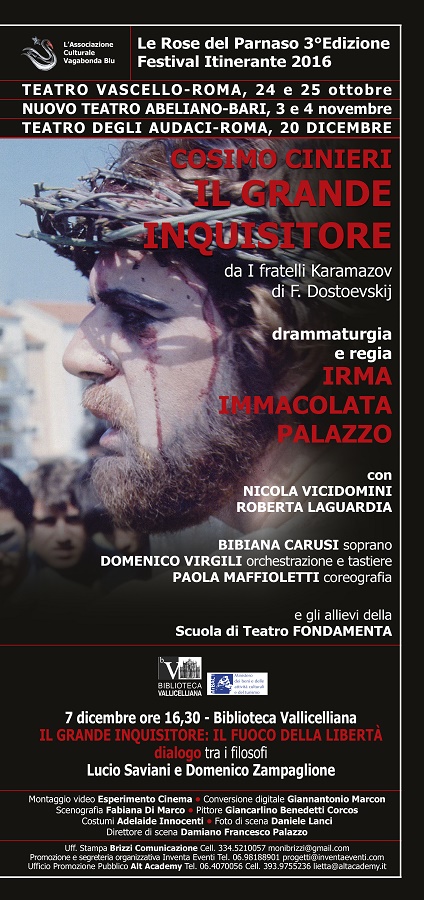 In contrappunto, il canto del soprano Bibiana Carusi, che scopriremo infine essere il Doppio di quel Cristo in borgata. Da Madonna Addolorata per quel Figlio destinato al Golgota e fuori per destino da qualsivoglia agognato sogno materno, il soprano infine si fa silenzioso Cristo anch’esso, di fronte all’eloquio del sofista Inquisitore. Simmetrici, sul lato destro della scena, spettatori e poi commentatori della filippica dell’Inquisitore, i due fratelli Karamazov: Ivan (Nicola Vicidomini), autore del poemetto messo in scena, e Alioscia (Roberta Laguardia), altro Doppio del Cristo, qui a testimoniare in maniera più umana una variante della divina –fattasi umana- comprensione, nei confronti del fratello che finirà pazzo a causa delle sue idee.