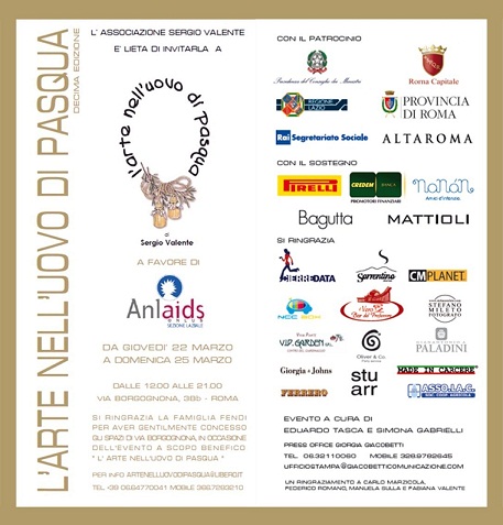 Giunto alla X edizione, “L’arte nell’uovo di Pasqua” sarà inaugurato a Roma il prossimo 21 marzo alle 19.00 presso lo spazio espositivo di via Borgognona 38 B gentilmente concesso dalla famiglia Fendi per l’evento benefico. Alla serata organizzata come sempre da Eduardo Tasca e Simona Gabrielli, parteciperanno gli artisti autori delle 40 opere. Saranno presenti inoltre esponenti della moda dello spettacolo, del design e delle istituzioni.