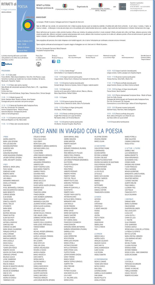 Si svolgerà a Roma venerdì 5 febbraio (dalle 9.30 alle 19.30), presso il Tempio di Adriano, in Piazza di Pietra, la decima edizione della manifestazione «Ritratti di poesia»,che vedrà la partecipazione di affermati autori stranieri –Carol Ann Duffy (Scozia), Joy Harjo (USA), Nuno Jùdice (Portogallo), Angèle Paoli (Francia), Rati Saxena (India), Jesper Svenbro (Svezia) – e gli italiani Domenico Alvino, Dina Basso, Corrado Benigni, Vito Bonito, Domenico Cipriano, Stelvio Di Spigno, Milena de Magistris von Rex, Giancarlo Majorino, Mariella De Santis, Gabriele Frasca, Vincenzo Frungillo, Franca Grisoni, Tomaso Kemeny, Isabella Leardini, Andrea Longega, Aldo Nove, Rosa Pierno, Maria Pia Quintavalla, Silvio Raffo, Mariù Safier, Mario Santagostini, Nevio Spadoni, Alberto Toni.
